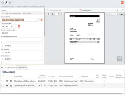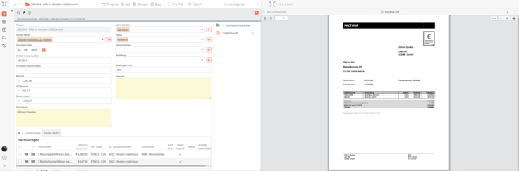 Voorbeeld van een inkoopfactuur, weergegeven in een hoofdscherm (links) en een secundair venster (rechts).